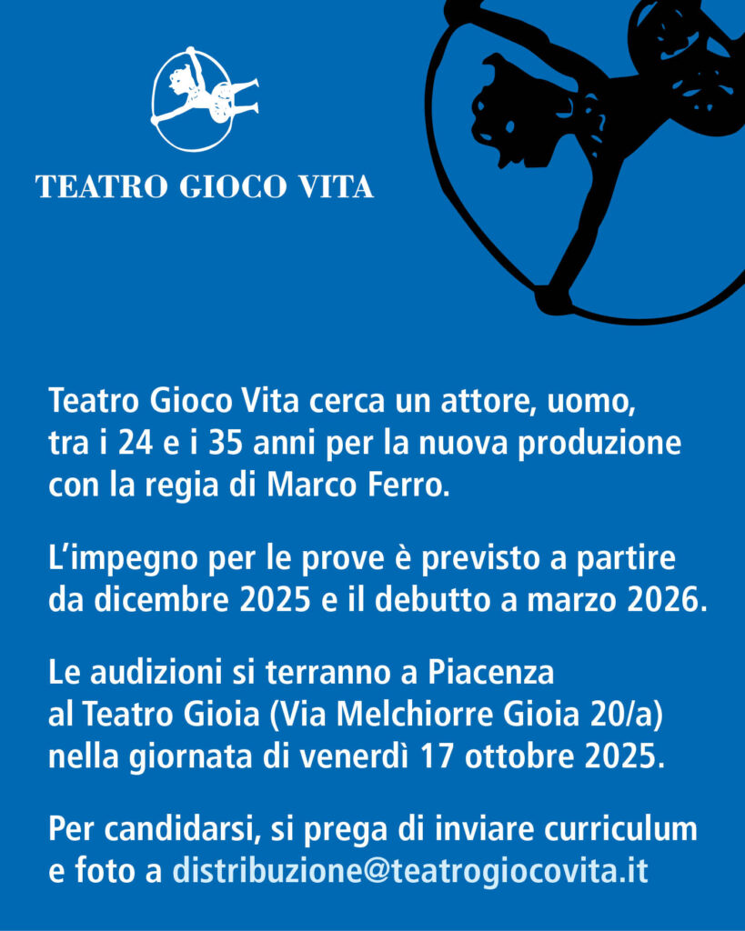 TEATRO GIOCO VITA ricerca un attore, uomo, tra i 24 e i 35 anni, per la nuova produzione con la regia di Marco Ferro. L’impegno per le prove è previsto a partire da dicembre 2025 e il debutto a marzo 2026.