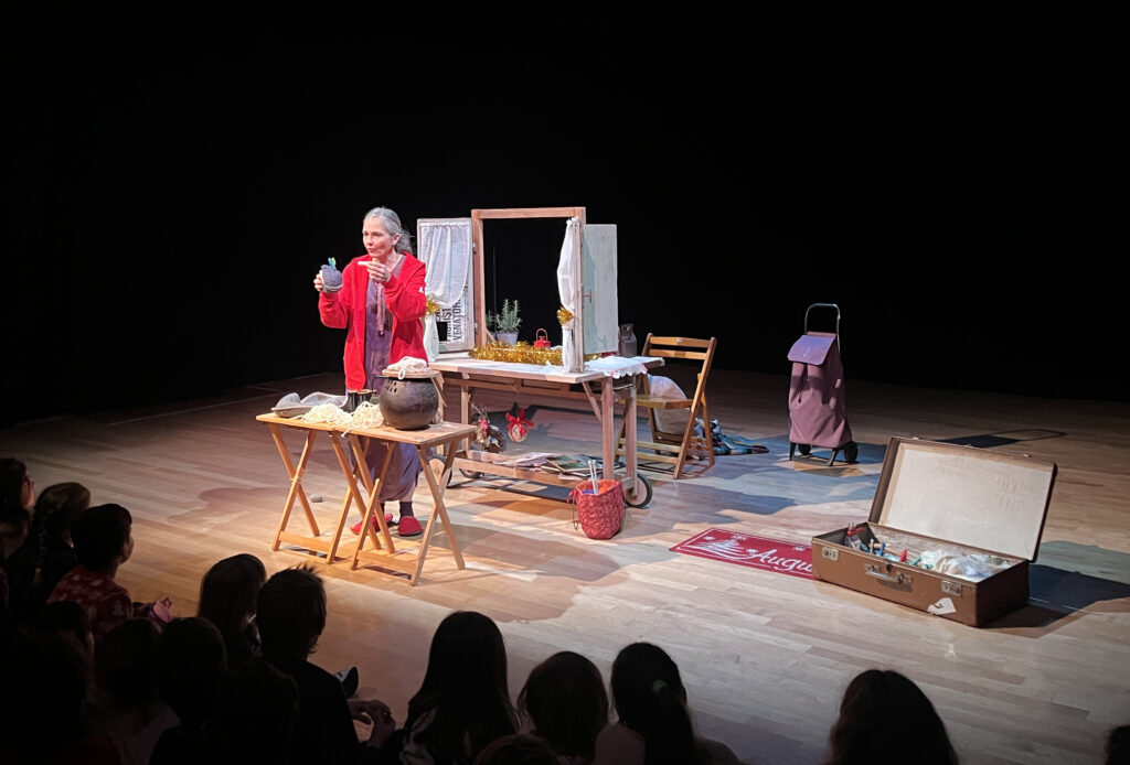 È quasi Natale, si aspetta la neve, o forse è già caduta coprendo i tetti e le case. I bambini e le bambine con il naso all’insù attendono impazienti, speranzosi di vedere i bianchi fiocchi cadere dal cielo. C’è una donna dietro a una finestra che legge, legge, legge… poi si guarda attorno e si accorge che ci sono tanti piccoli occhi a guardarla e tante piccole orecchie pronte ad ascoltarla. E nella sua casetta ci sono tante cose con cui si potrebbe giocare. Allora inizia a rovistare nelle sue scatole e nei sacchetti della spesa appena fatta e racconta… racconta le storie di Natale. Può capitare che una zucchina si trasformi in uno dei protagonisti di una storia natalizia, che un giubbotto si trasformi in un orso polare, che una fetta di limone voli fino in cielo e diventi uno spicchio di luna. Gli oggetti di uso quotidiano, la frutta e la verdura finalmente salgono su un palcoscenico a prendersi i meritati applausi! Per festeggiare anche loro il Natale. E tutti i bambini fanno una promessa: una volta usciti dal teatro diventeranno raccontatori di storie, perché le storie – soprattutto le storie di Natale – hanno bisogno della voce di tutti noi per continuare a vivere.